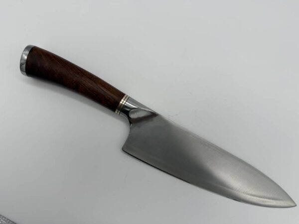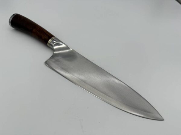 The perfectly balanced 8-inch blade handles all kitchen tasks with ease: slicing meat, chopping vegetables, mincing herbs, and more. Its mirror-polished finish adds elegance, while the ergonomic handle provides a secure, comfortable grip for extended use.