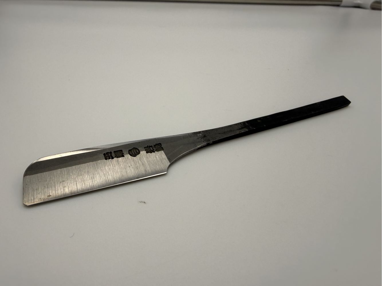 Un authentique rasoir de barbier japonais (kamisori) fabriqué dans la tradition du célèbre atelier de Shigeyoshi Iwasaki à Sanjō, dans la préfecture de Niigata.