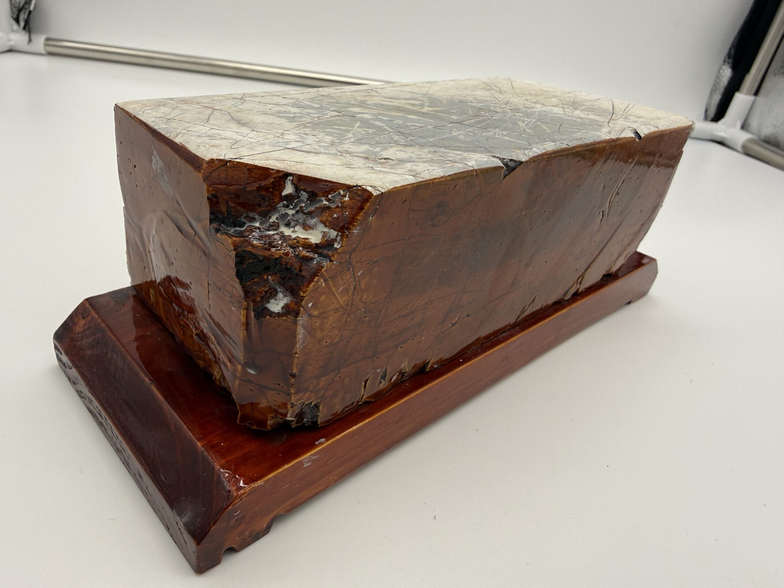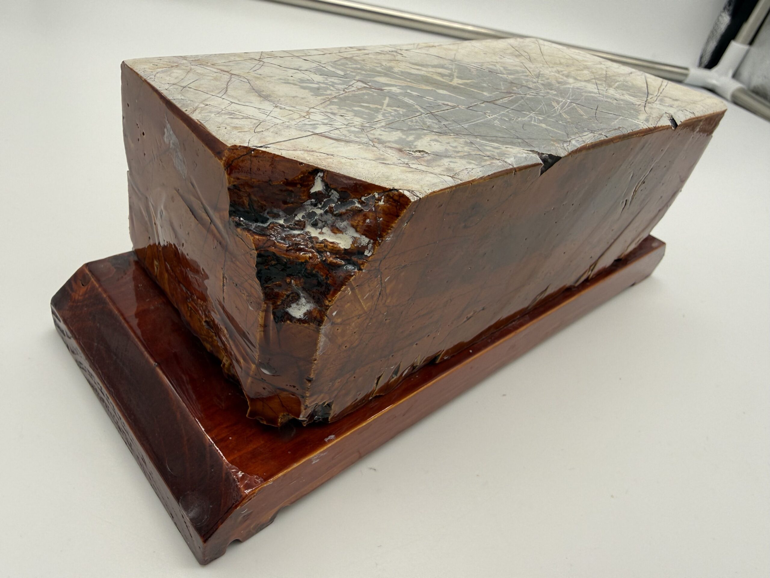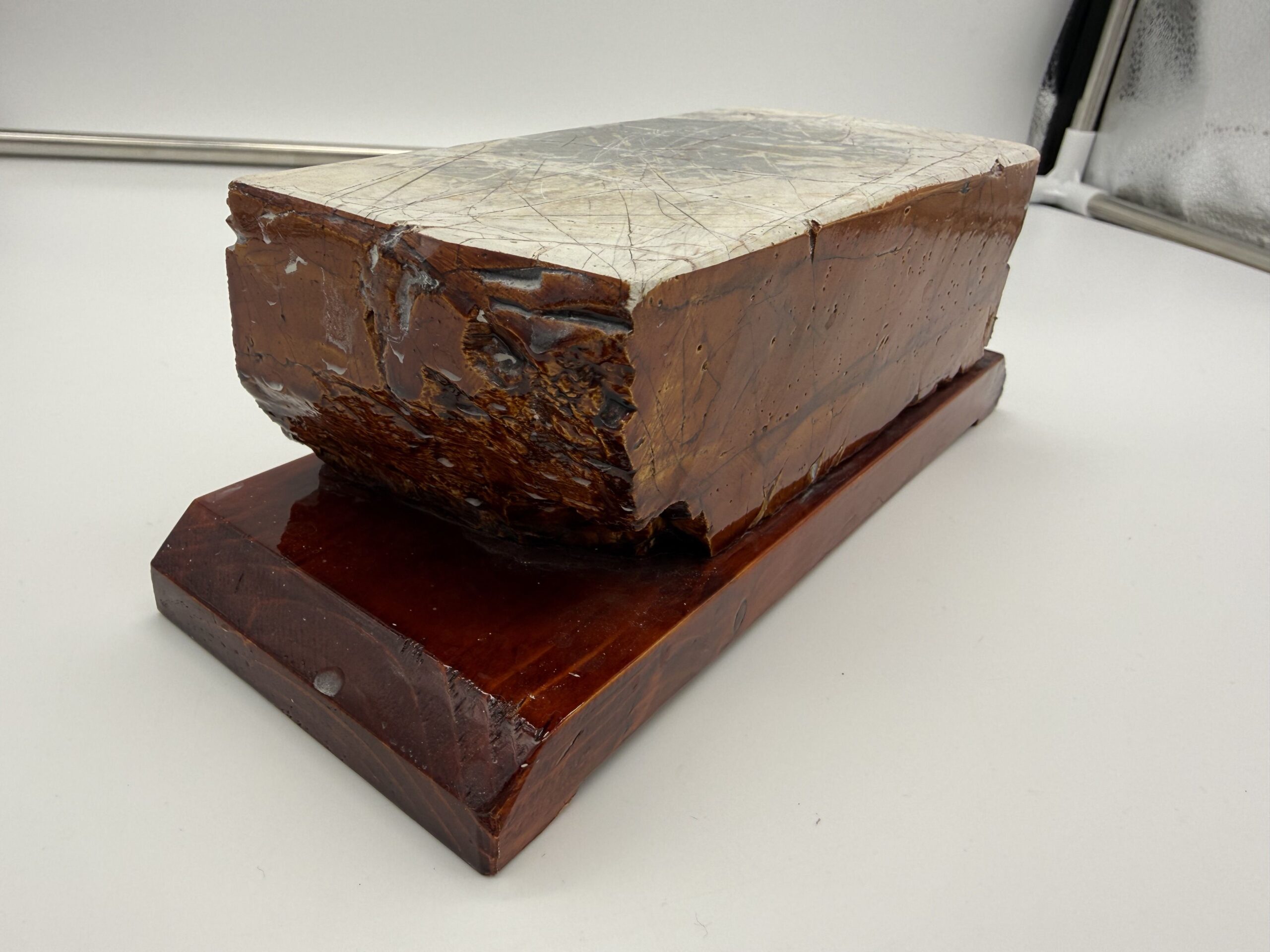 Akmuo priklijuotas ant stabilaus, gražiai nulakuoto tamsaus medinio stovo, kuris ne tik suteikia estetikos, bet ir užtikrina patogų bei stabilų darbą.