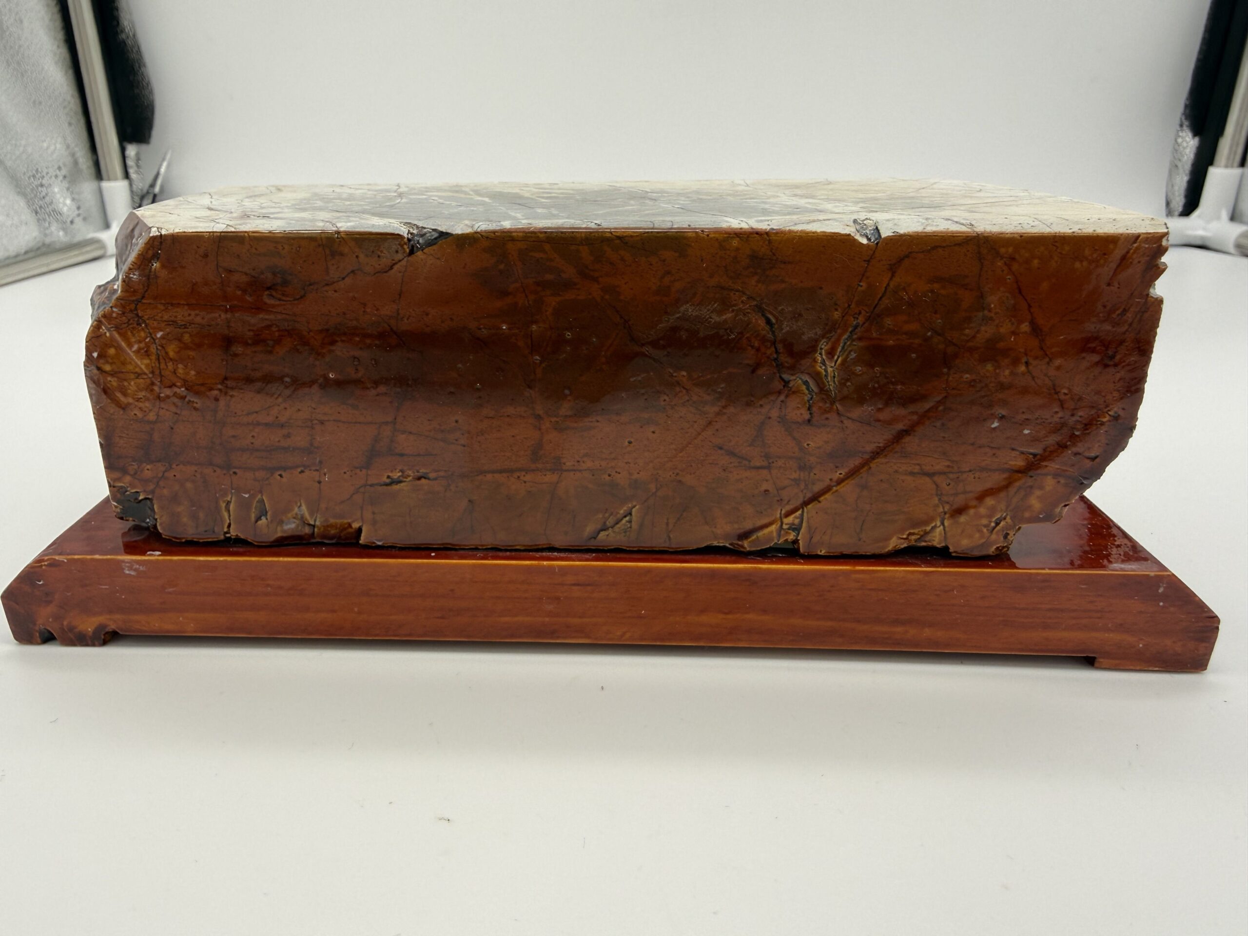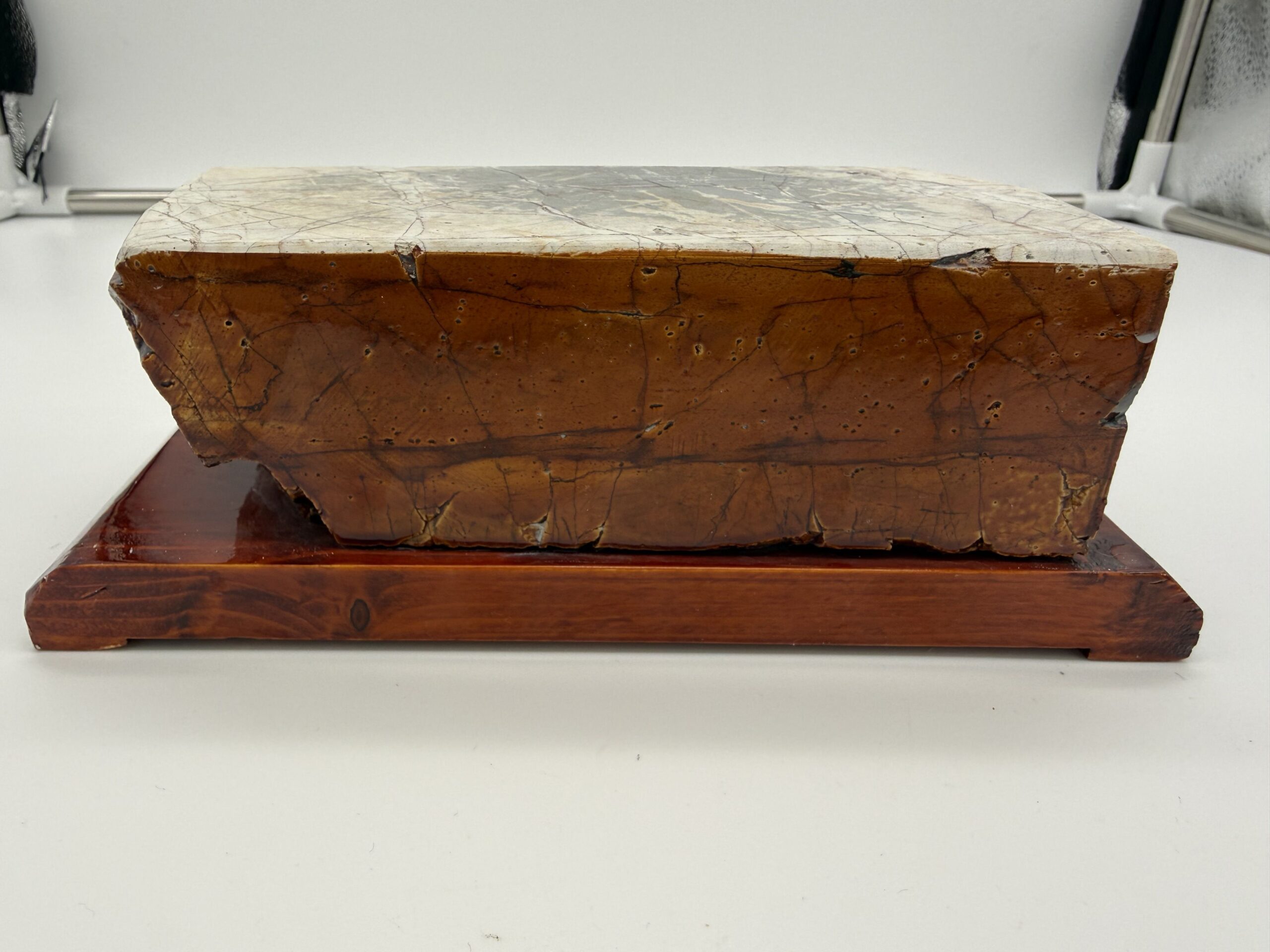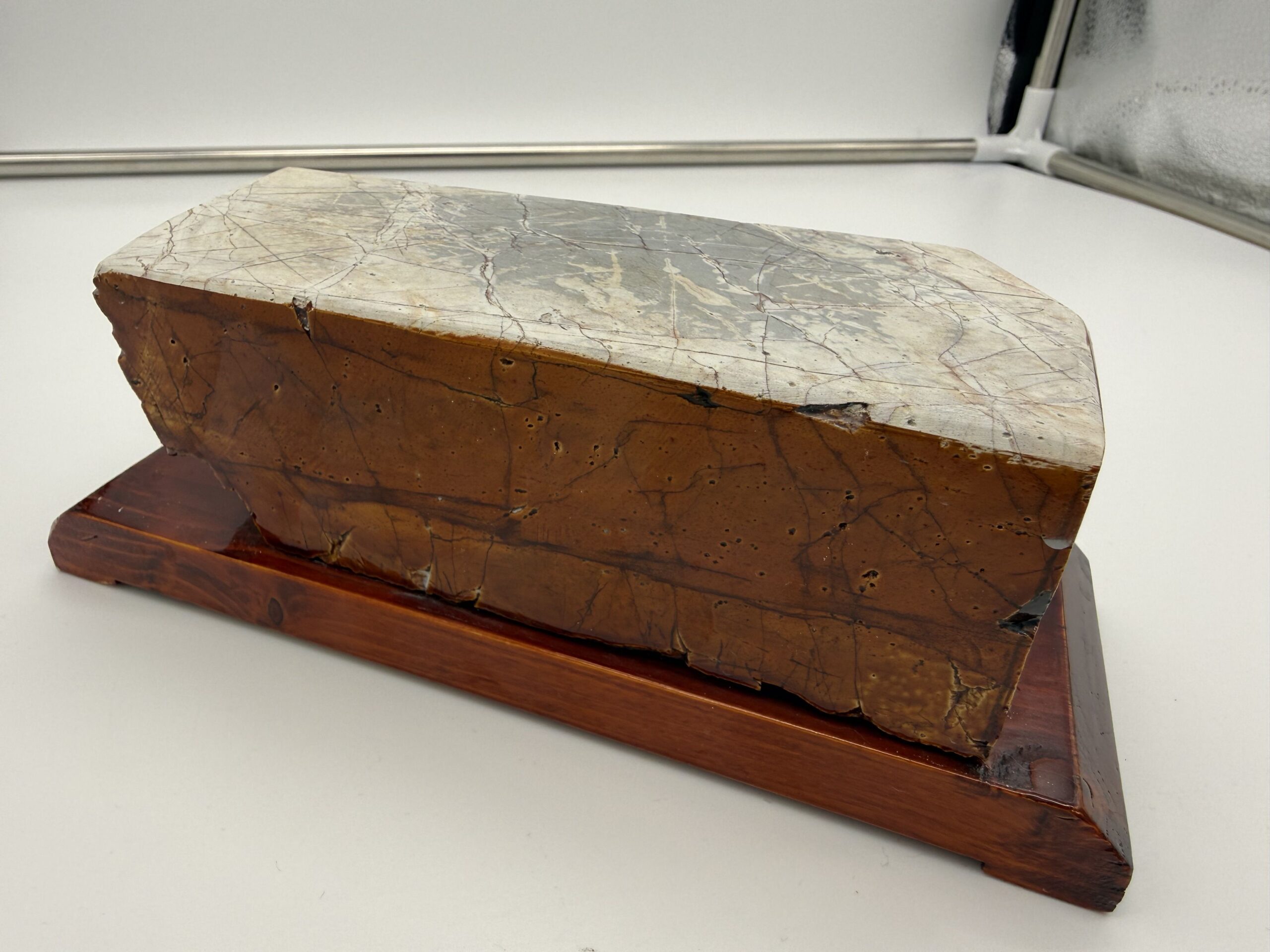Akmuo priklijuotas ant stabilaus, gražiai nulakuoto tamsaus medinio stovo, kuris ne tik suteikia estetikos, bet ir užtikrina patogų bei stabilų darbą.